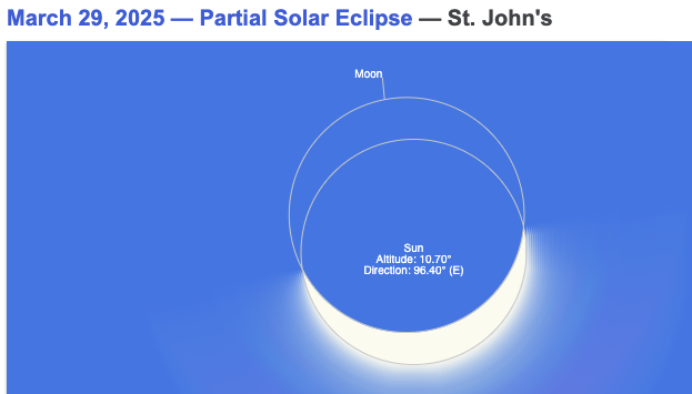 This Saturday morning, March 29, 2025, a partial solar eclipse will be visible across Newfoundland and Labrador. This celestial event occurs when the Moon partially covers the Sun, creating a dramatic crescent shape in the sky. With 85–86% of the Sun obscured at peak coverage, this will be one of the most significant eclipses visible in our region for years.